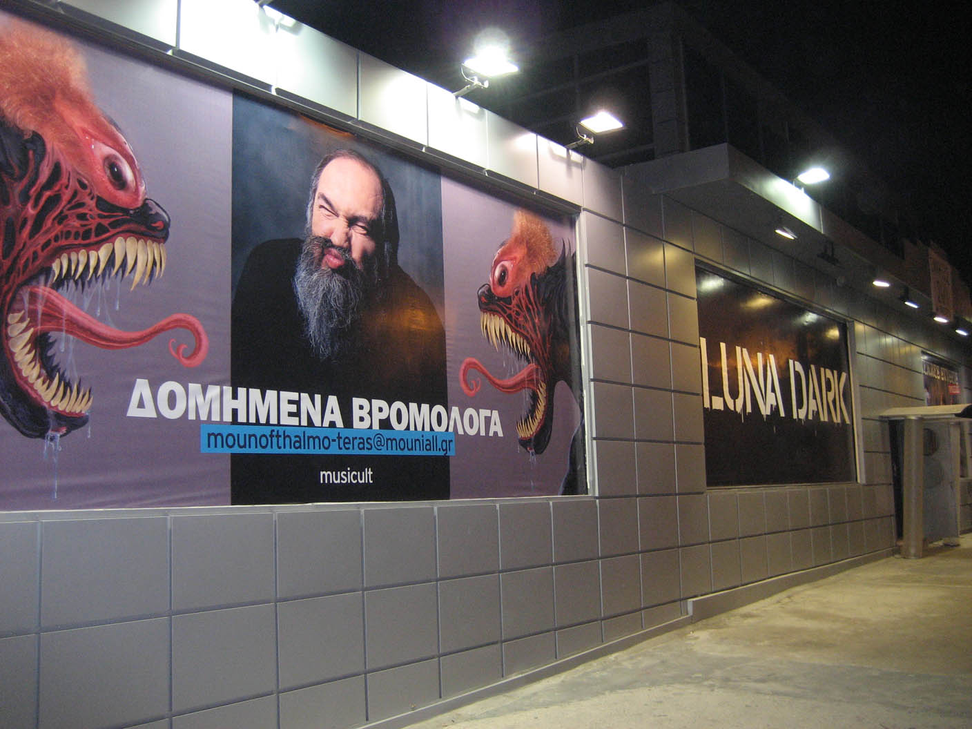 Από την Πέμπτη 24 Γενάρη 2008, ο συμπαγής καλλιτέχνης Τζίμης Πανούσης [με τους συνήθεις συνεργάτες του] έρχεται αντιμέτωπος με το mounofthalmo teras που ελλοχεύει στο διαδυκτιακό τόπο mounial.gr αφού είδε και αποείδε [το Χάρο με τα μάτια σου] στήνει ένα musicult με δομημένα βρομόλογα στο χώρο θεαμάτων Luna Dark επί της Ιεράς Οδού στον Αριθμό 30 [τηλ: 210-3460377], όπου θα παρουσιάζεται κάθε Πέμπτη, Παρασκευή και Σαββάτο στις 10:30 και κάθε Κυριακή στις 9:30. Μουνόφθαλμο τέρας παπάκι μουνιάλ τελεία τζι αρ για ελληνορθόδοξους χρήστες με ειδικές ατάκες. Η σάτιρα [μακριά από εμάς], ο Αριστοφάνης, ο Στηβ Κακέτσης, ο Λάκης, ο Μάκης, η Σούλα, τα κατσαριδάκια μου γλυκά, δεν έχουν καμία σχέση με τα δομημένα βρομόλογα του επί της ουσίας βαθειά συντηρητικού Πανούση.Ο Τζιμάκος και το τέρας θα βγάζουνε τα μάτια τους επί σκηνής για περιορισμένο αριθμό παραστάσεων. Ελάτε να απολαύσετε ένα επάγγελμα, το οποίον θα εκπέσει οσονούπω από τα βαρέα και τα ανθυγιεινά.